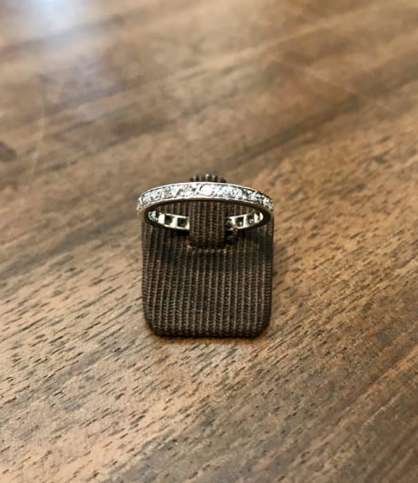 Alliance "Tour complet" en or blanc 750 millièmes serti de 22 diamants taille ancienne.