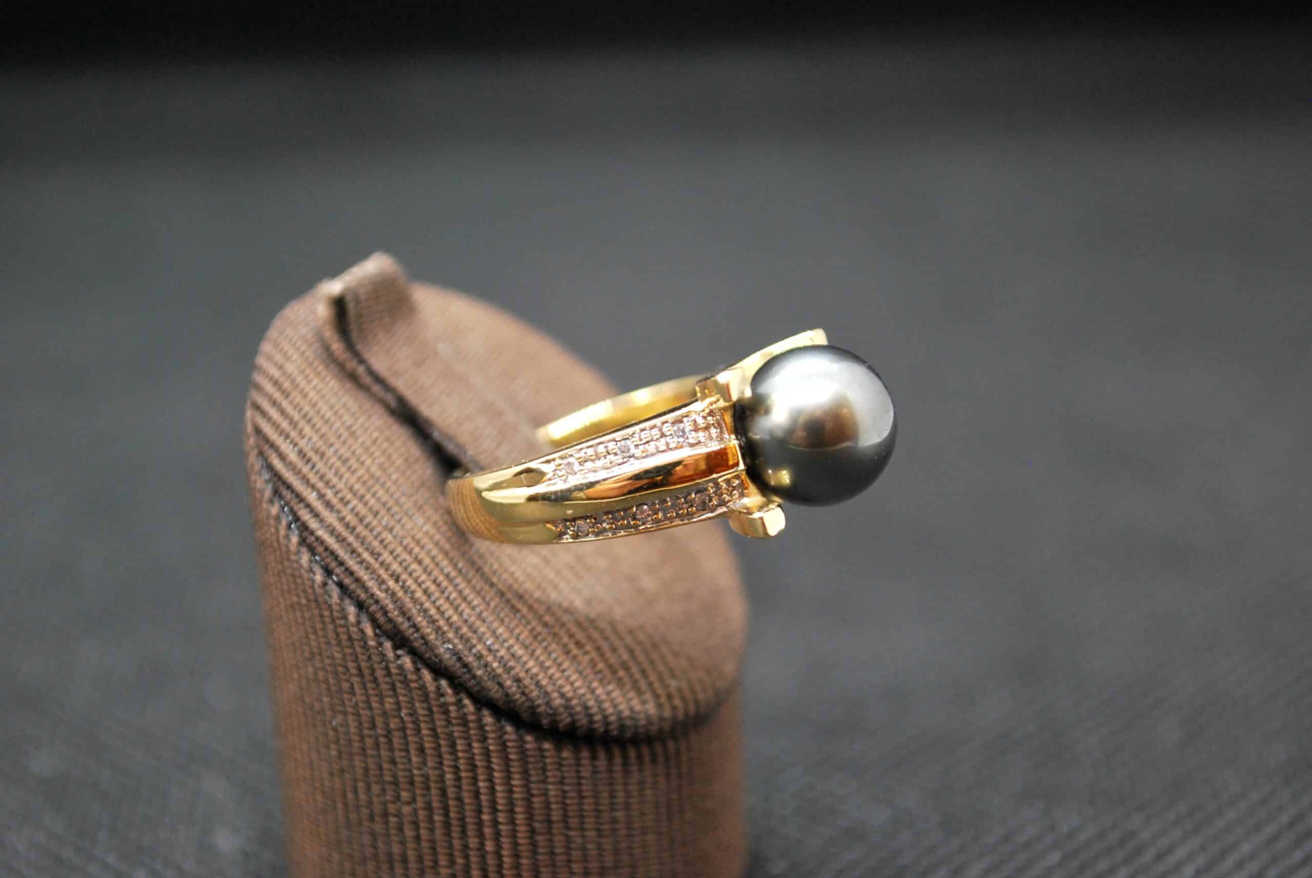 Magnifique bague en Or Jaune 750 millièmes avec une très belle Perle de Tahiti de 8,9mm et accompagnée de 12 diamants de 0,005 carat chacun.