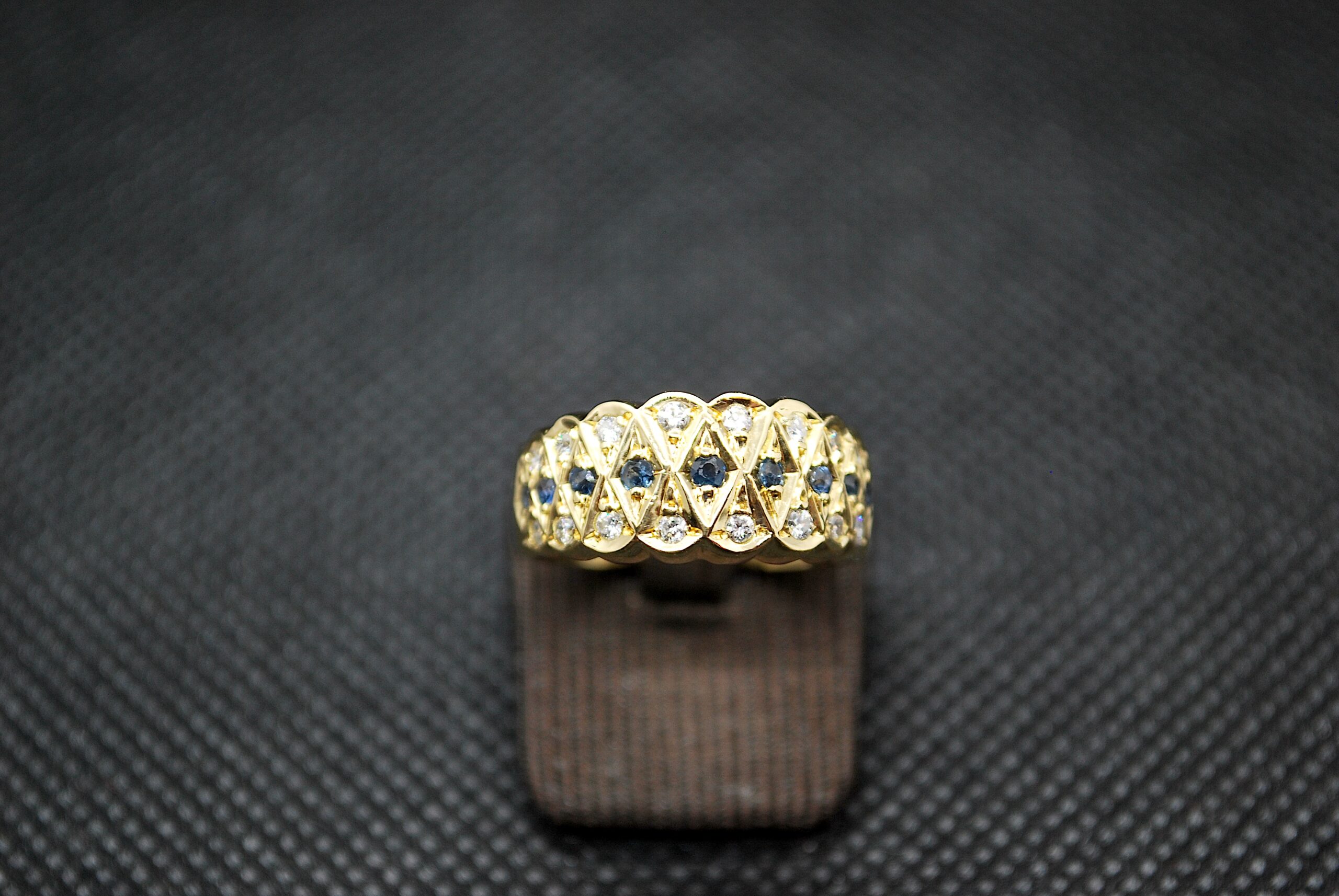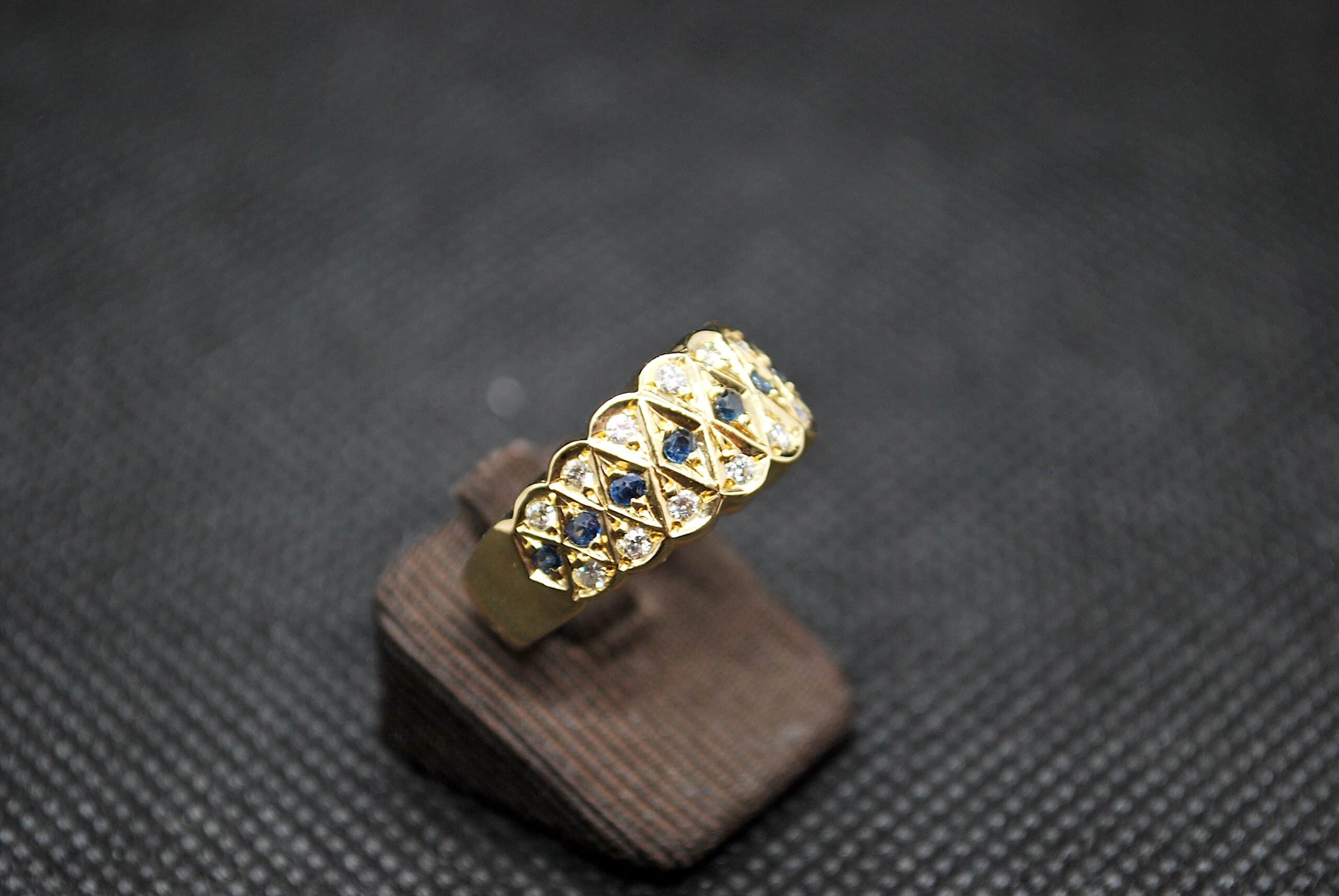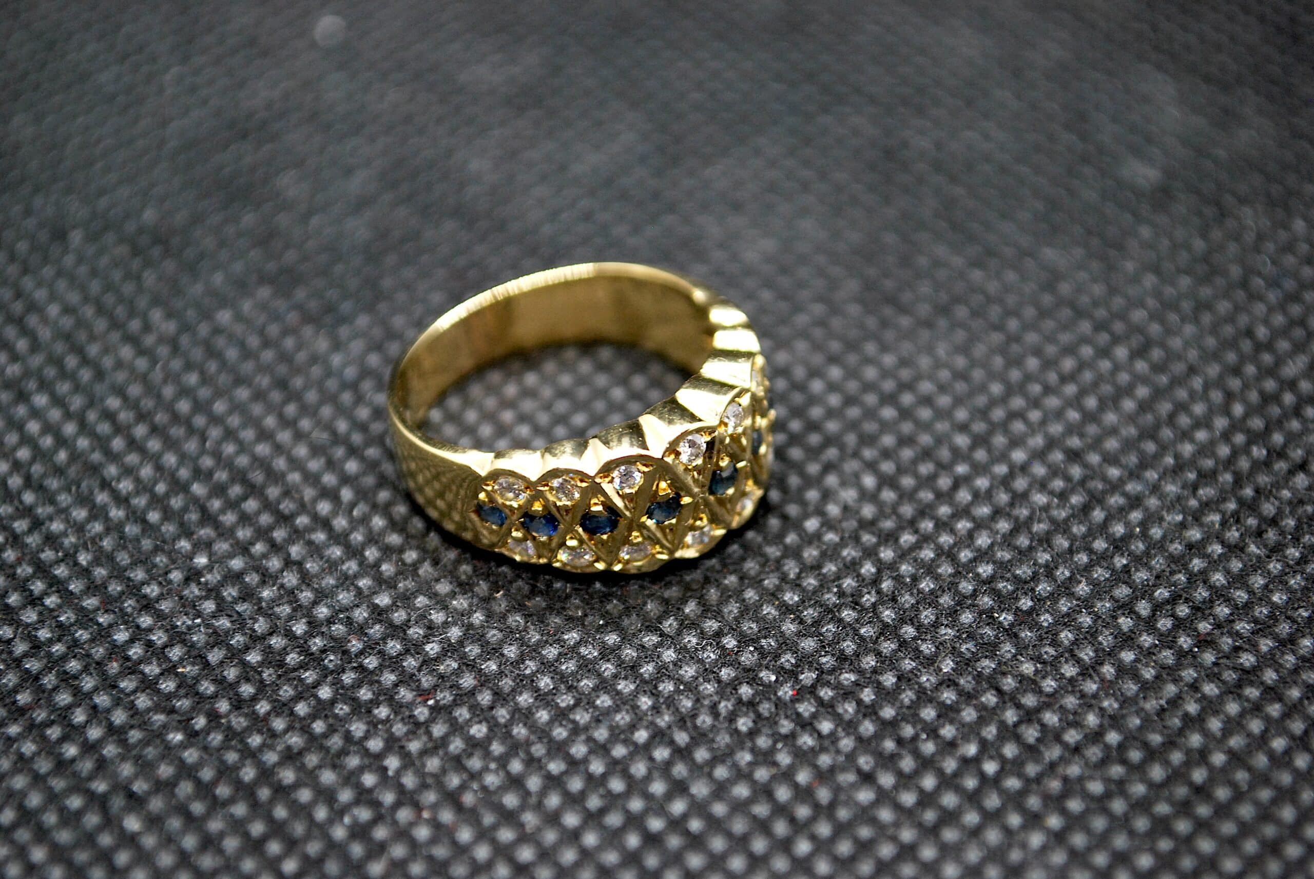 Nous certains que vous craquerez après avoir découvert cette très jolie bague d'occasion en Or Jaune 750 millièmes sertie de Saphirs et de Diamants. Son style épuré et élégant saura vous accompagner dans toutes les occasions.