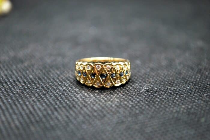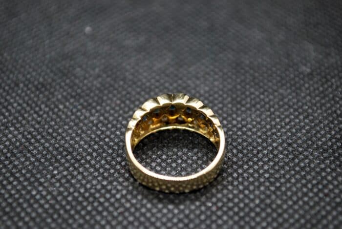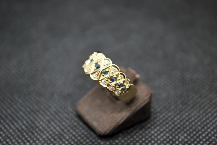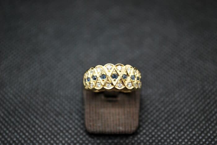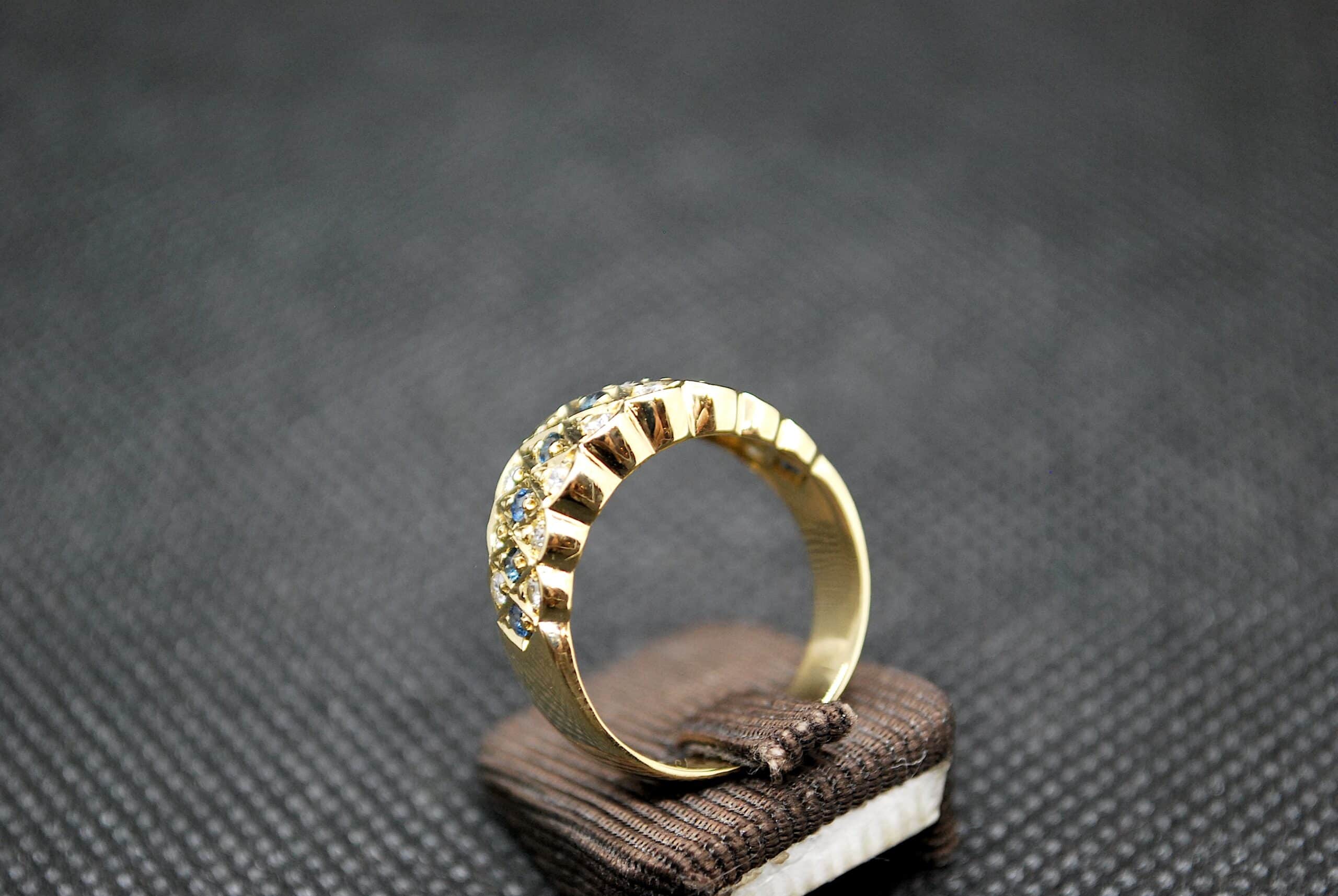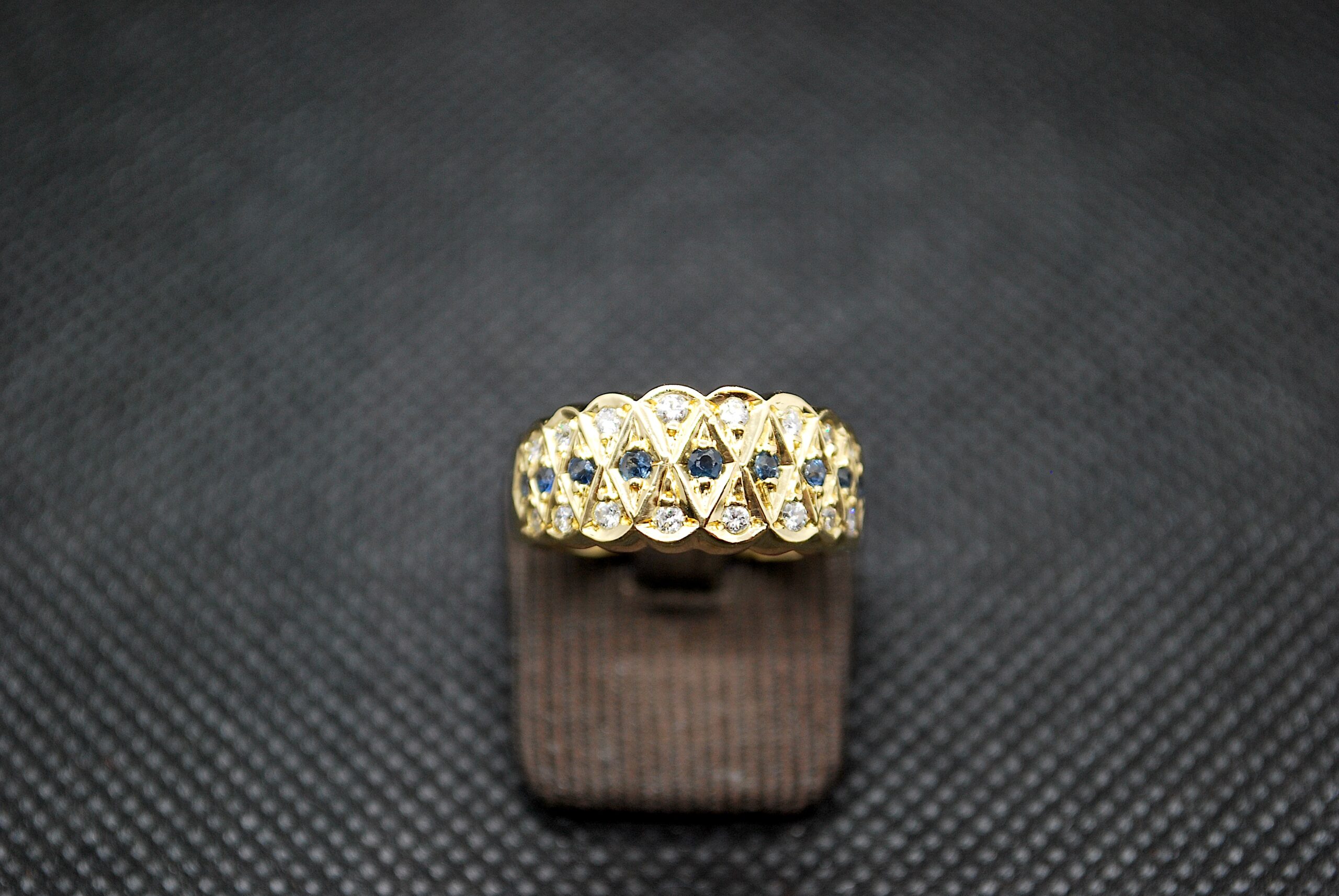 Nous certains que vous craquerez après avoir découvert cette très jolie bague d'occasion en Or Jaune 750 millièmes sertie de Saphirs et de Diamants. Son style épuré et élégant saura vous accompagner dans toutes les occasions.