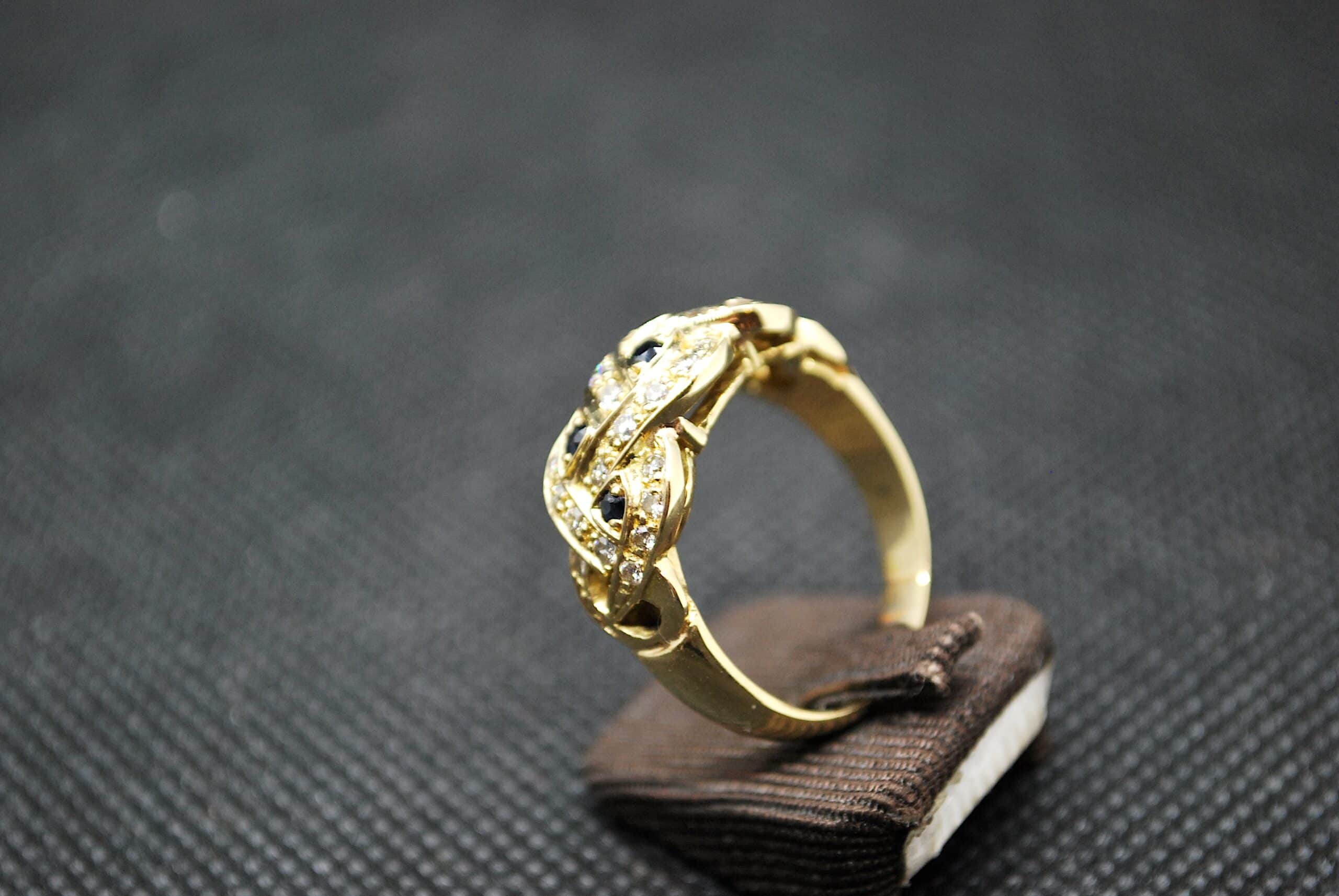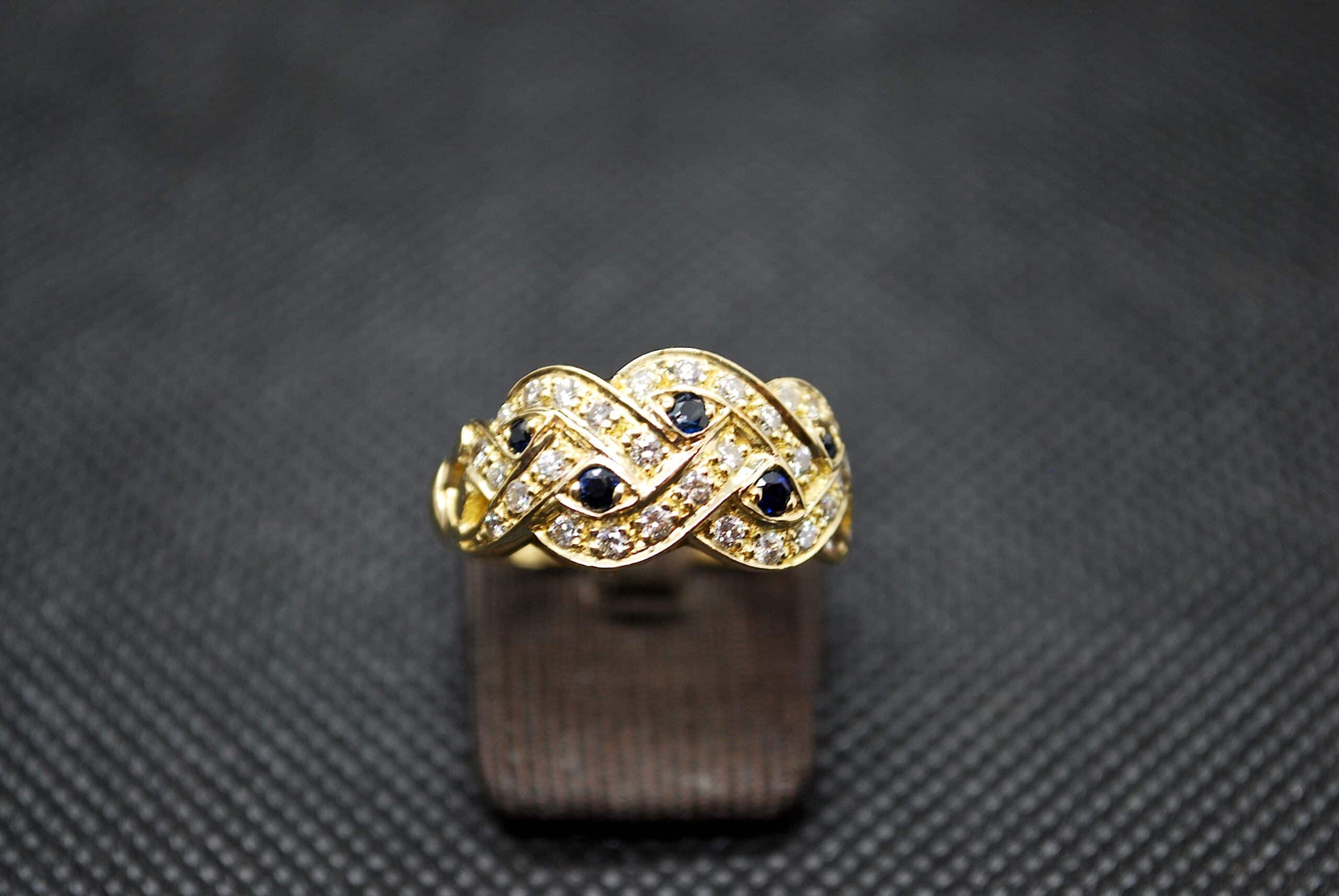 Bague d'occasion en Or Jaune 750 millièmes sertie de Saphirs et de Diamants, au design doux et sobre. Ses formes s'entrelaçant lui donne ce côté chic et élégant. Vous saurez apprécier la qualité de ce bijou tant par sa forme que par son élégance. A découvrir dans notre boutique lyonnaise ou commandez dans notre bijouterie en ligne et votre bijou sera livré à l'adresse de votre choix.