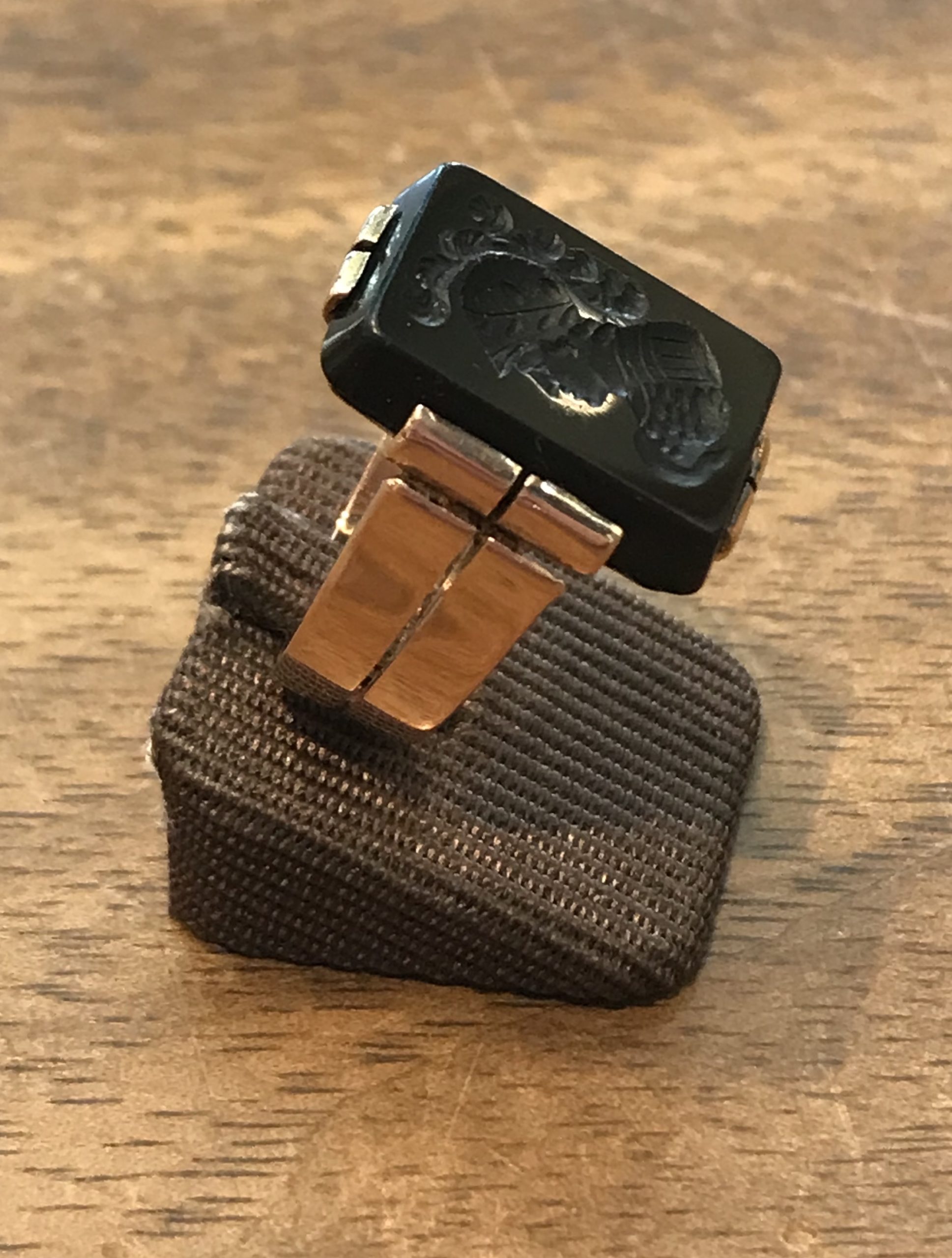 Magnifique bague ancienne en or rose 750 milliĂšmes serti d'une entaille faite sur une onyx noire.
