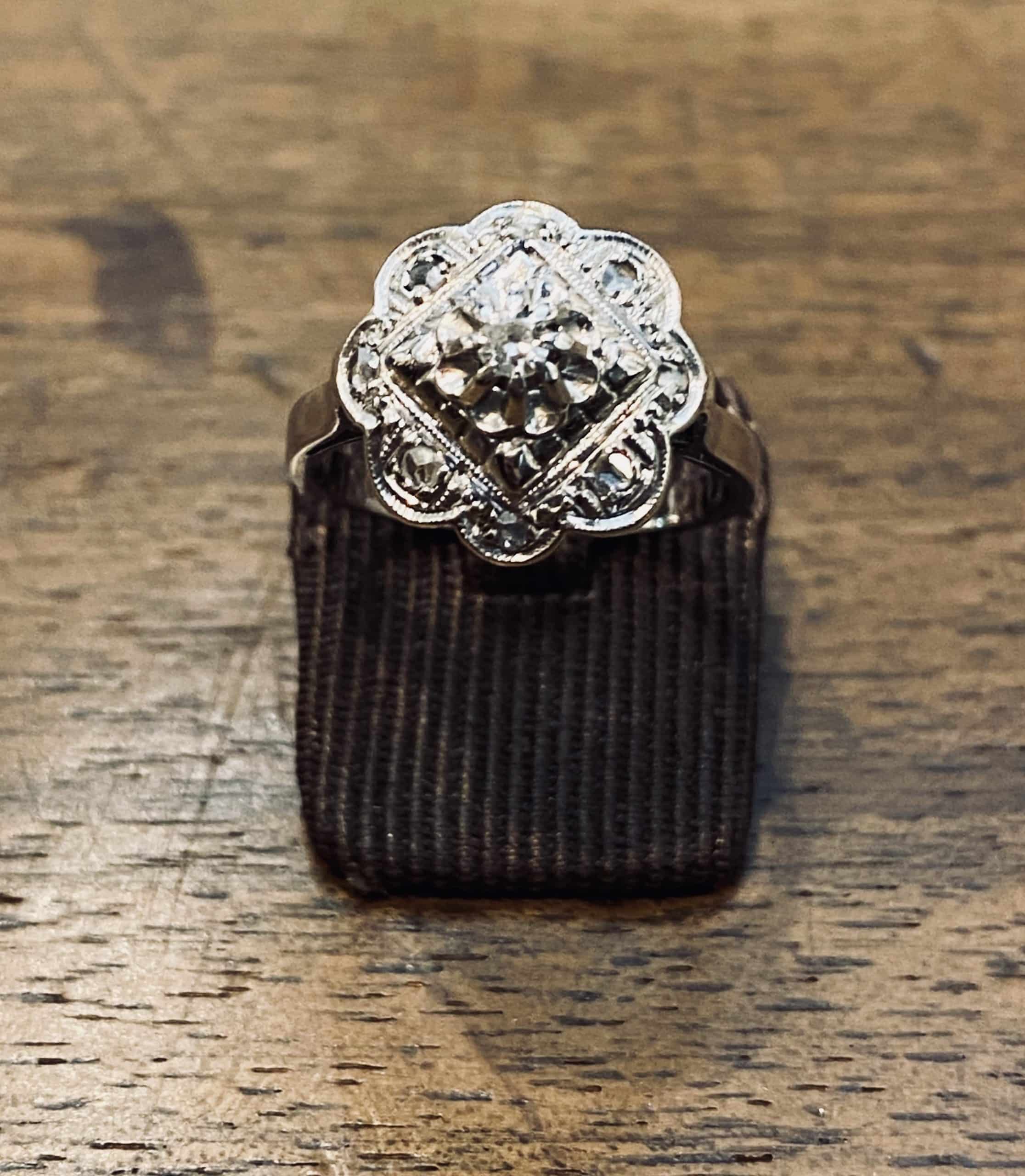 Trés jolie bague en or blanc 750 millièmes serti d'un diamants centrale accompagné de roses de diamants.