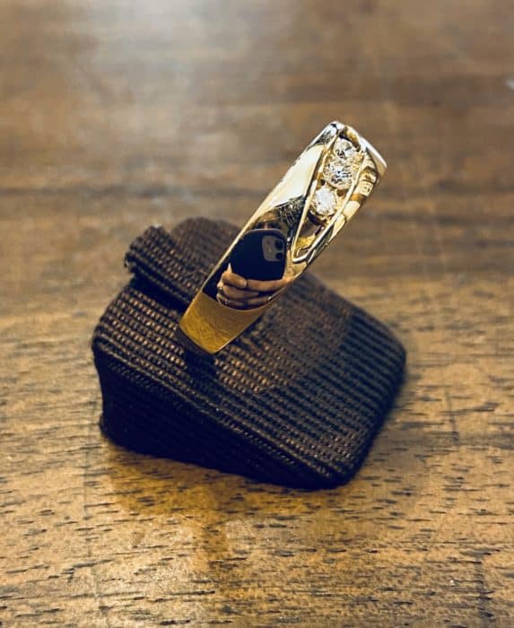 Trés jolie bague en or jaune 750 milliÚmes serti de 3 diamants de 0,05 carats.