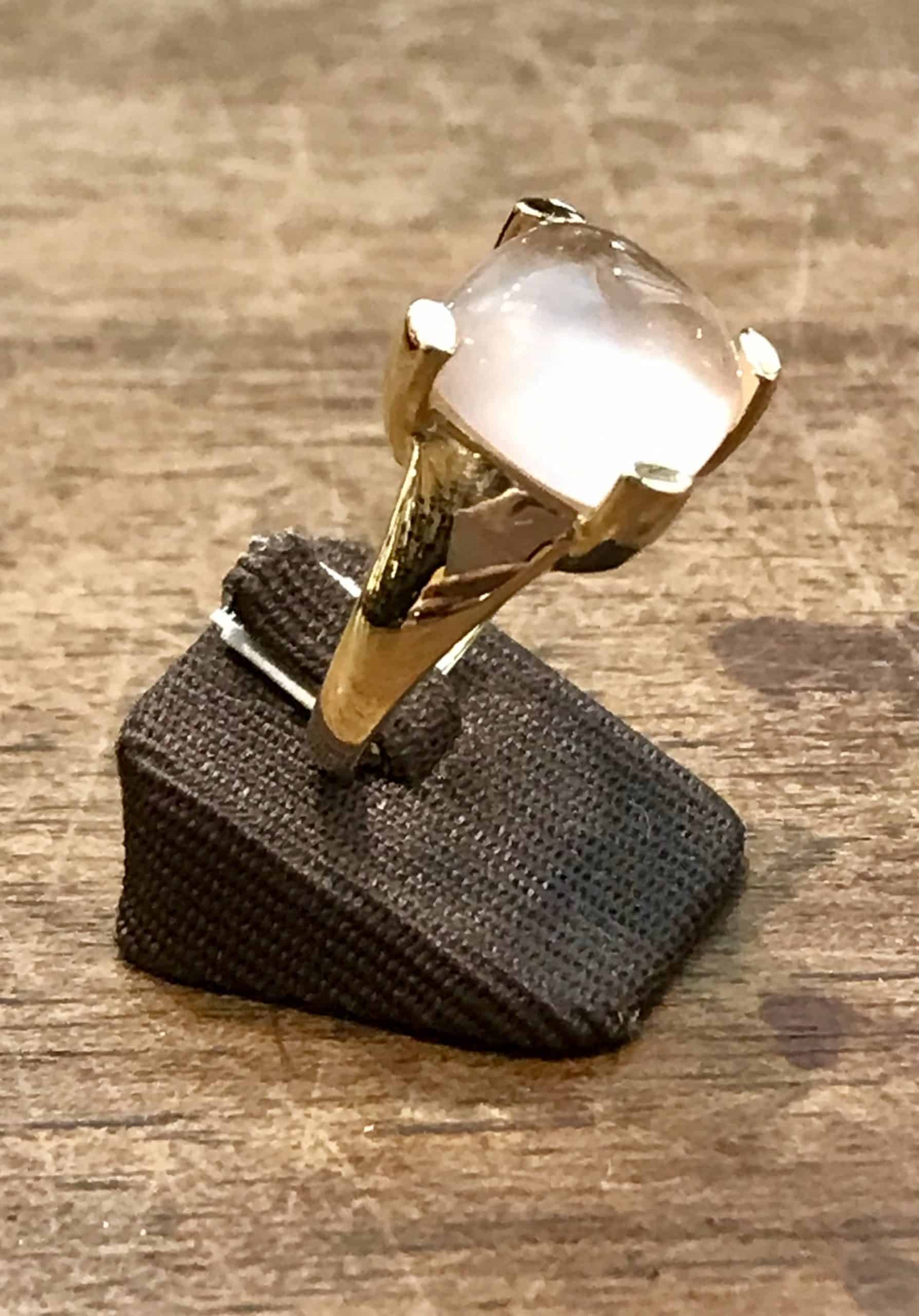 Magnifique bague en or jaune 750 milliĂšmes serti par 4 griffes d'un quartz rose.