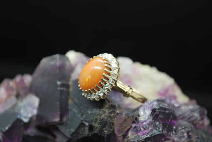 Nous vous proposons cette très belle bague au style unique en Or Jaune 750 millièmes, sertie au centre d'une Opale cabochon ovale de 12mm x 10mm et très joliment entourée de 25 diamants de environ 0,015 carat chacun. Les diamants de couleur G et pureté VS font ressortir tout l'éclat de l'Opale. Venez l'essayer dans notre boutique de Lyon au 23 rue Paul Chenavard à Lyon 1er
