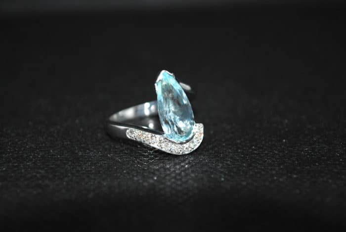 Bague en OR Blanc 750 millièmes sertie d'une Aigue-Marine de taille Poire pour un poids de 2,44 carats accompagnée de 9 Diamants de 0,03 carat chacun de couleur G et de pureté VS.