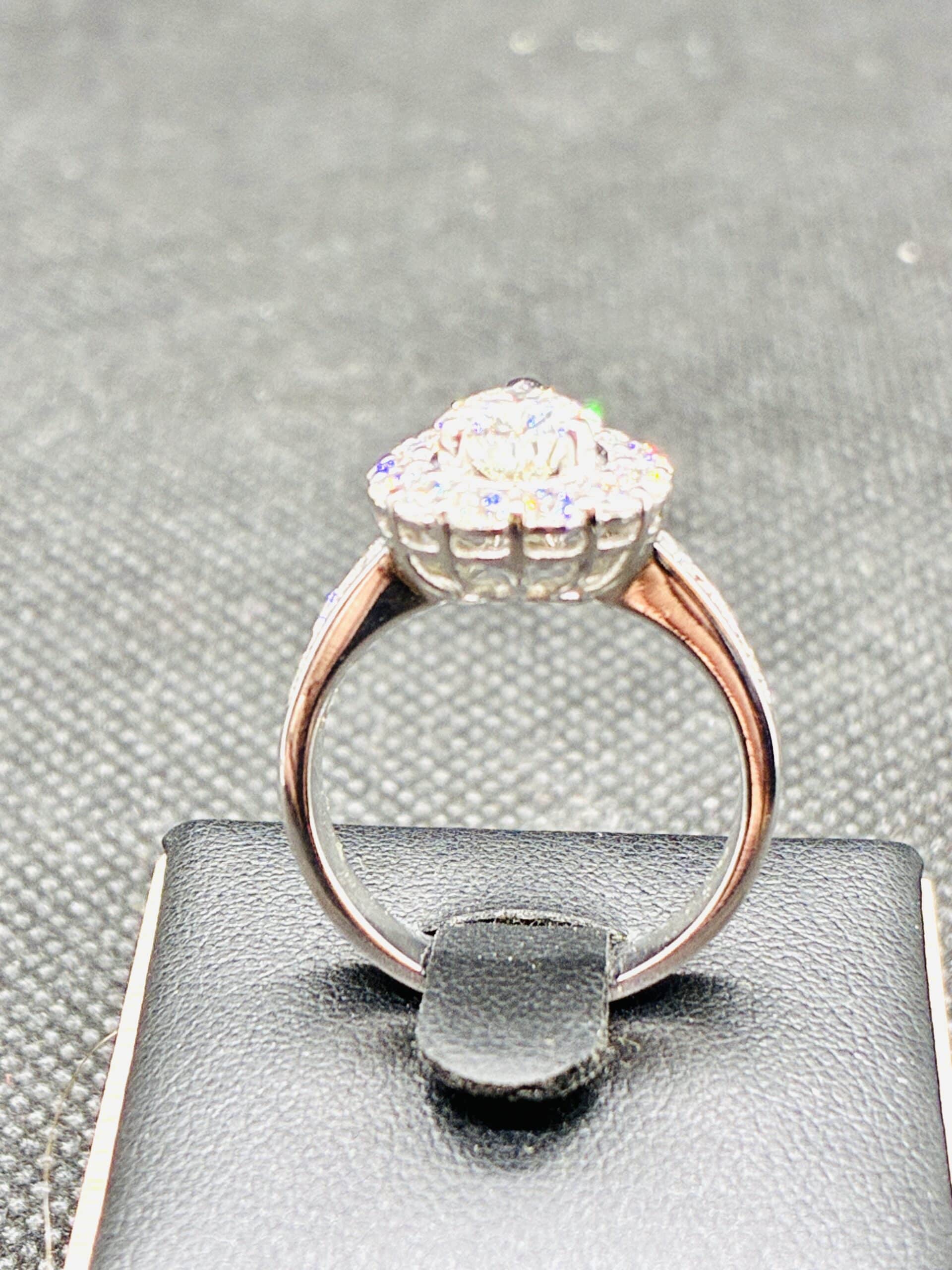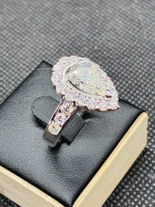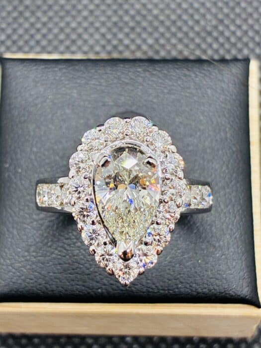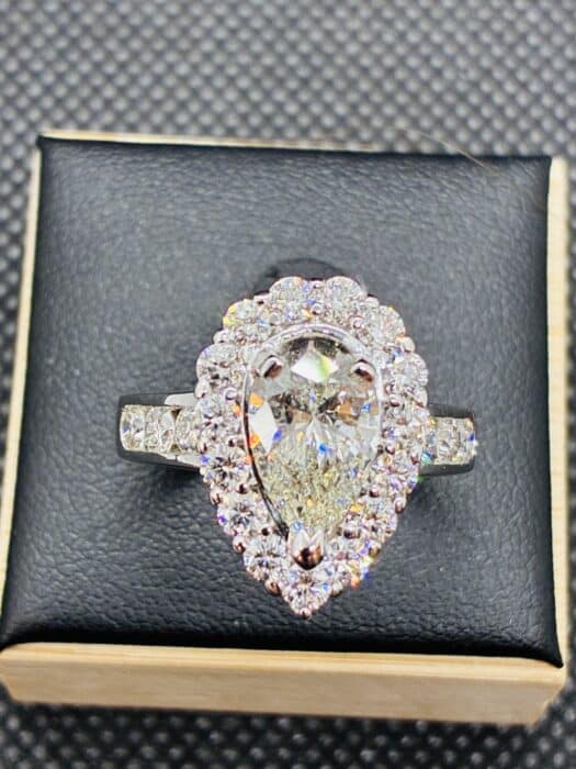 Nous avons le plaisir de vous faire découvrir cette sublime bague en Or Blanc 750 millièmes avec au centre son Diamant taille Poire de 1,82 carat environ et très joliment accompagné de 21 Diamants de 0,10 carat chacun. Son montage raffiné et élégant saura vous séduire. Vous saurez apprécier la qualité du travail réalisé pour la création de cette bijou exceptionnel. N'attendez plus pour venir l'essayer dans notre boutique lyonnaise et nous en sommes certains, vous l'adopterez."