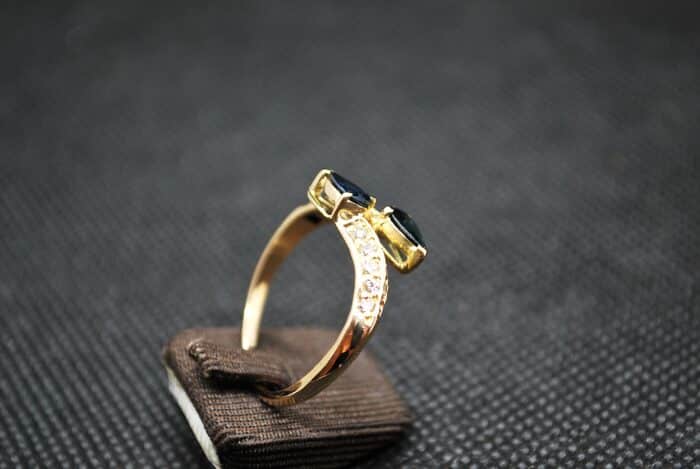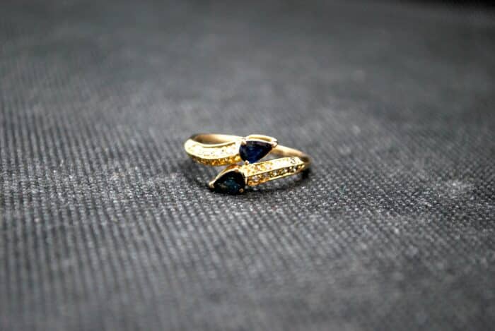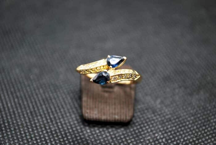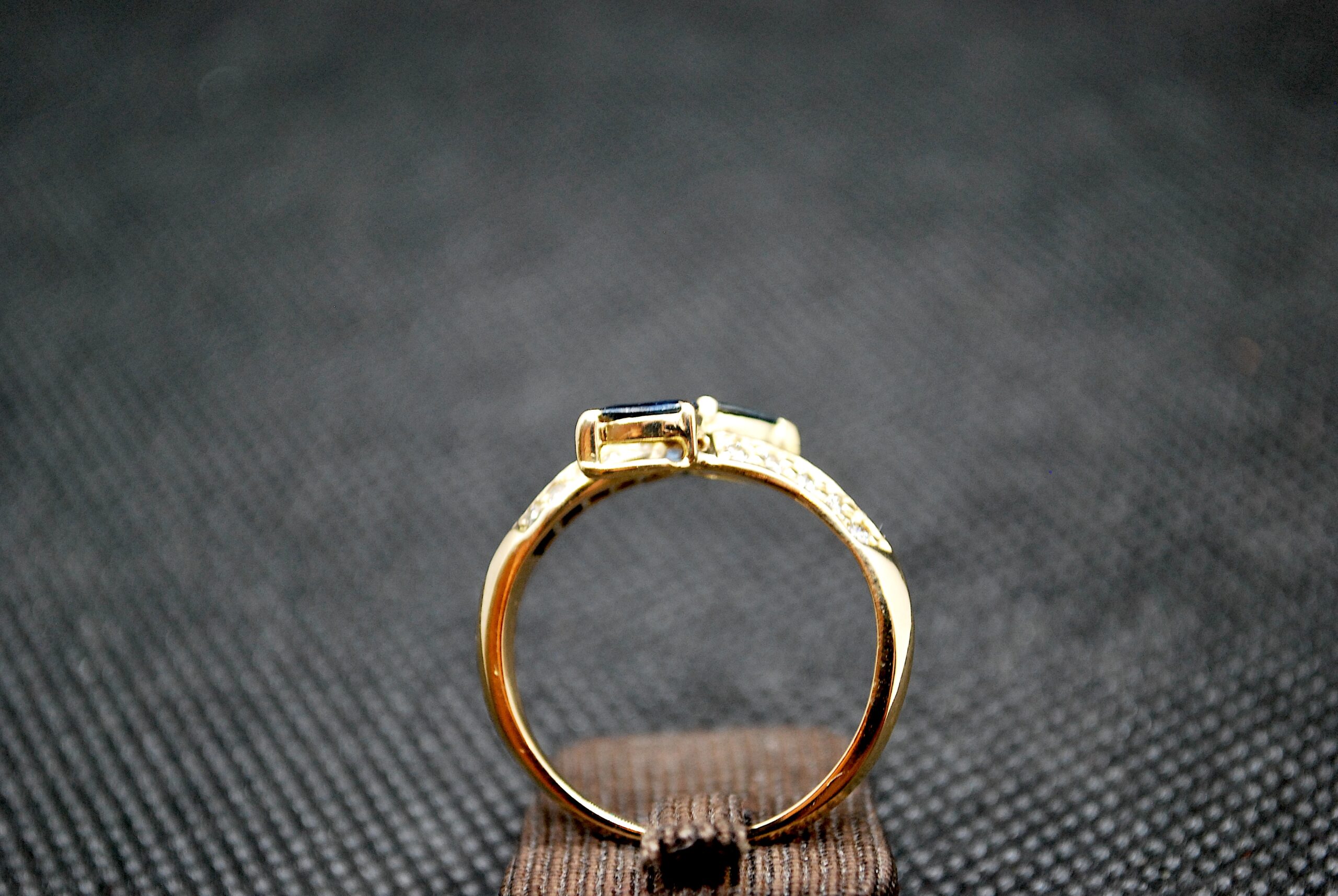 Découvrez cette très belle bague en Or Jaune 750 millièmes style Toi & Moi avec 2 Saphirs taille "Poire" accompagné de 20 Diamants de 0,01 carat chacun. Disponible dans notre boutique Lyonnaise ou livré gratuitement à l'adresse de votre choix.
