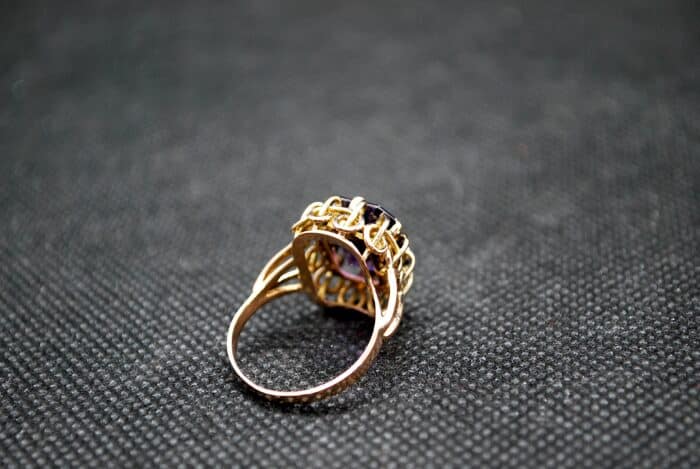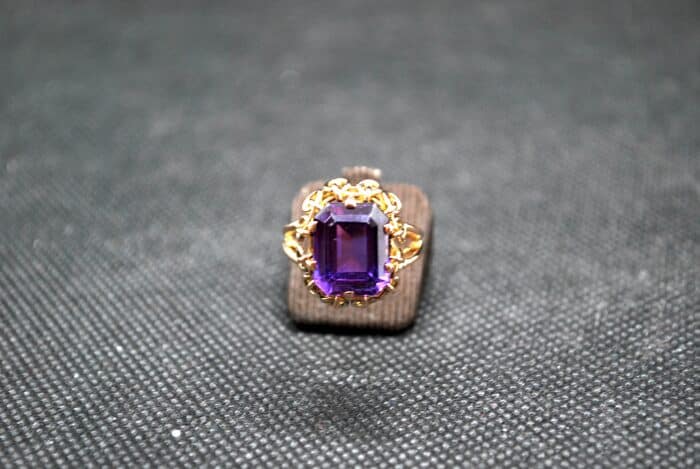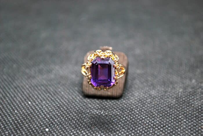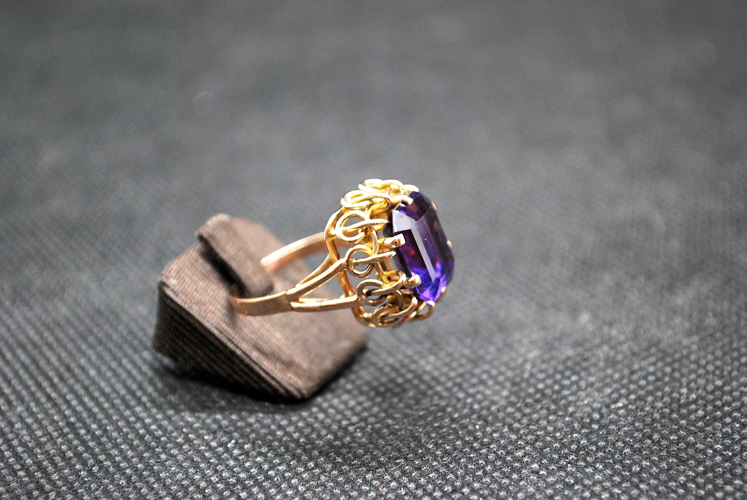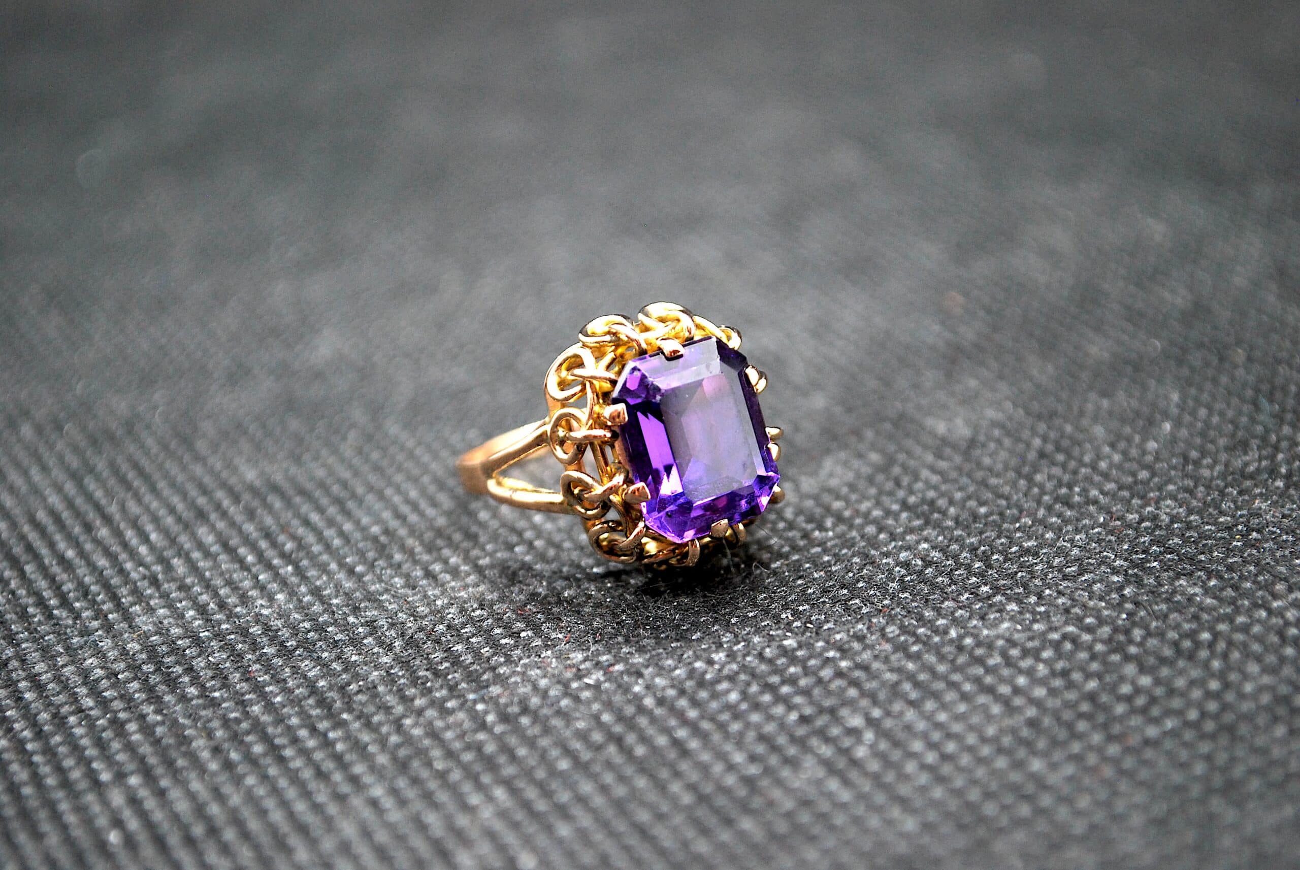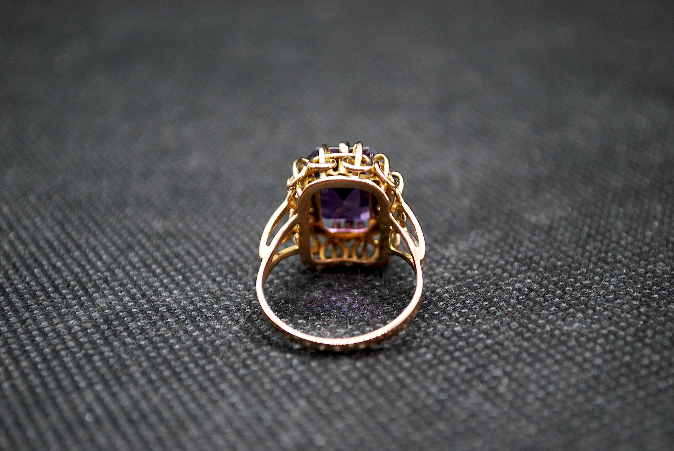 Très belle bague vintage en Or Rose 750 millièmes sertie d'une Améthyste taille Emeraude de 13mmx9mm. Vous saurez apprécier le travail réalisé pour le panier de ce bijou, lui donnant ce style unique.