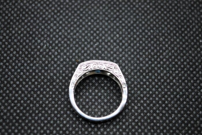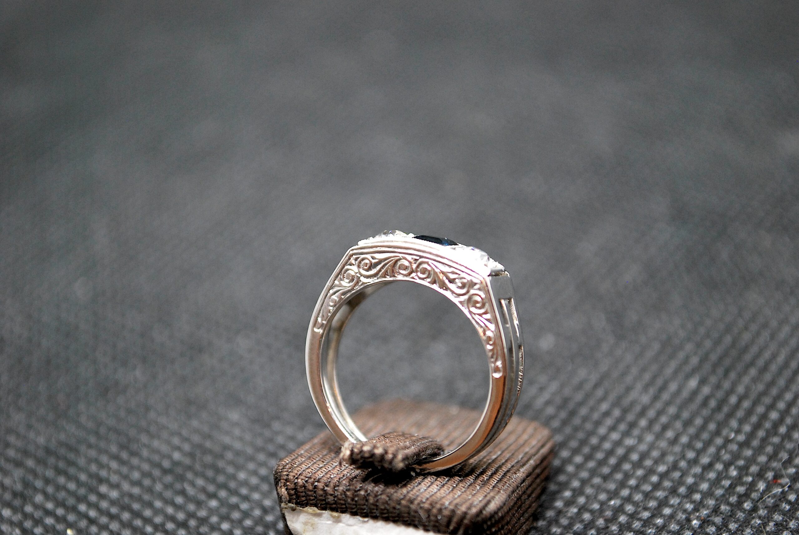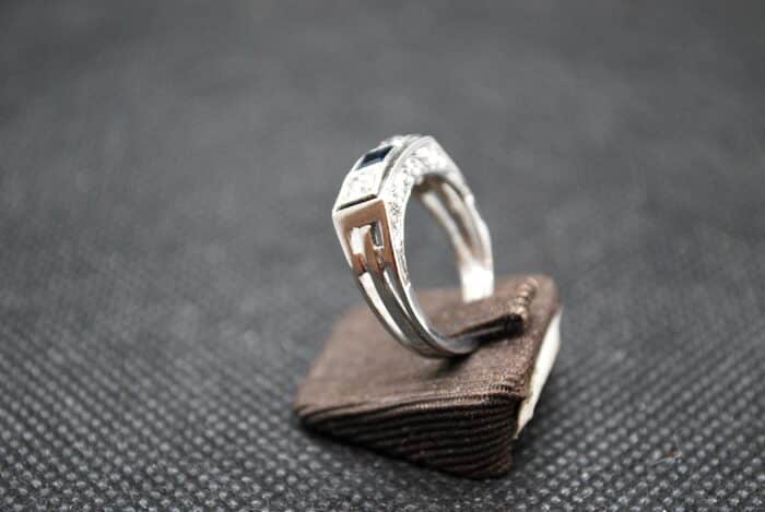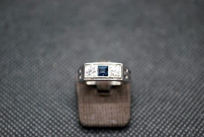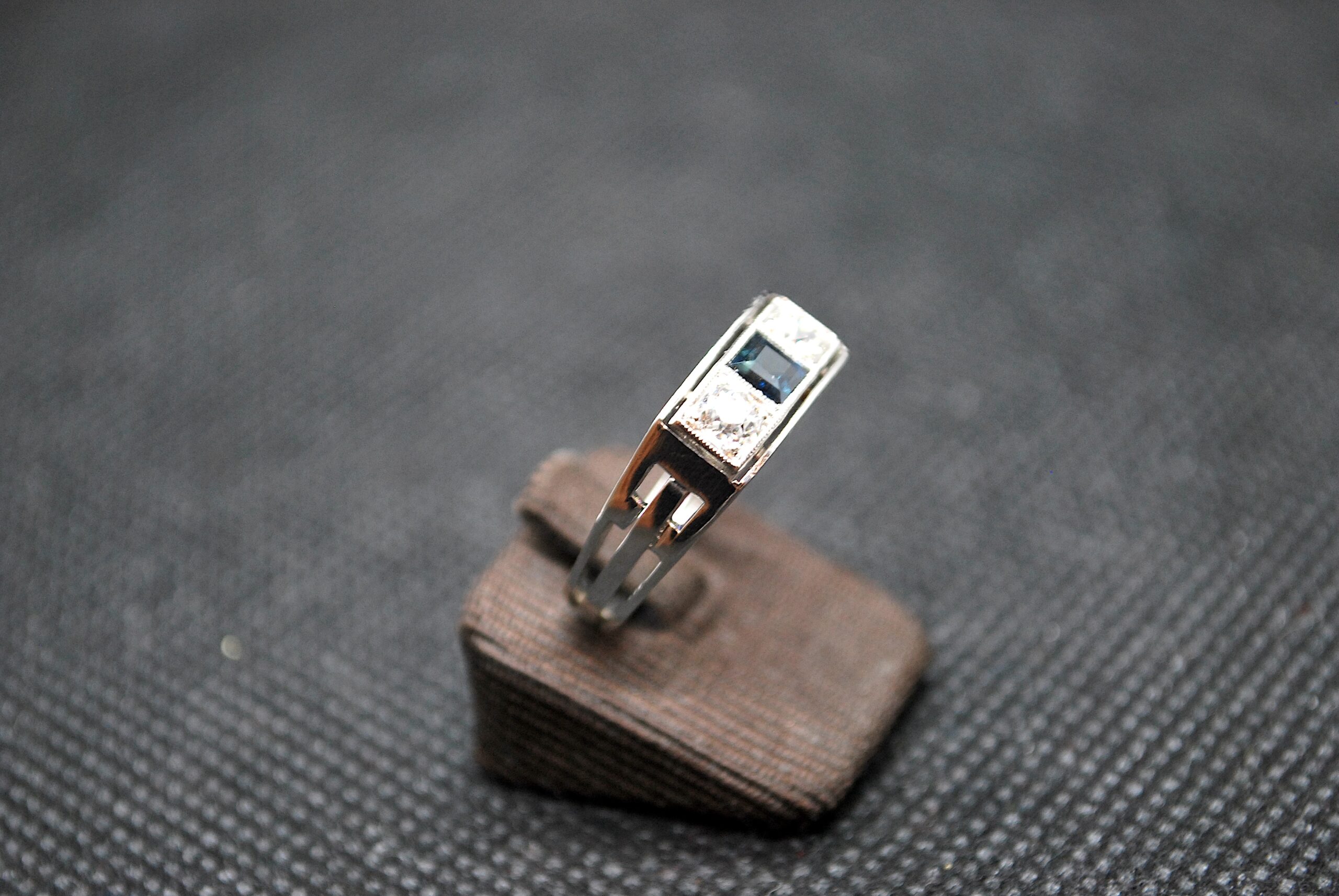 Bague ancienne Art déco en Platine sertie au centre d'un Saphir calibré et accompagné de 2 Diamants taille ancienne. Vous pourrez admirer le détail du travail réalisé sur les côtés extérieurs de la bague. A découvrir dans notre boutique lyonnaise ou à commander sur notre site de vente en ligne.