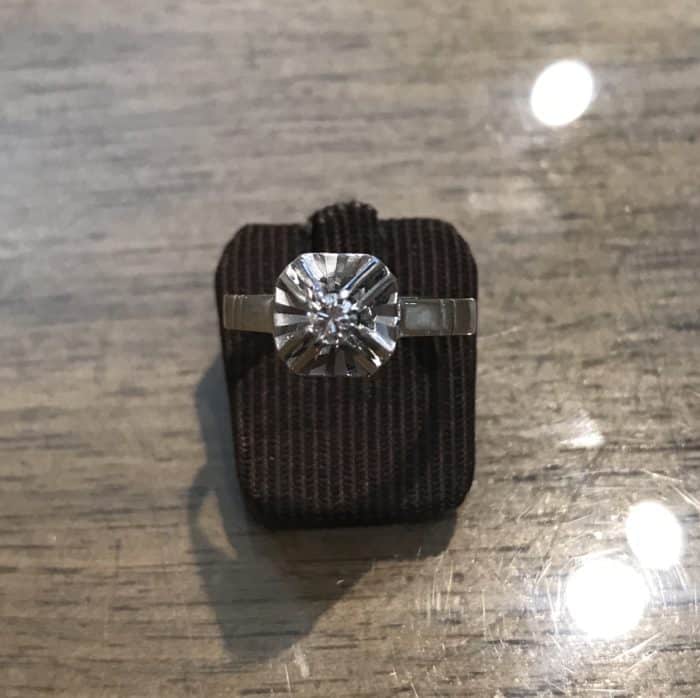 Solitaire vintage en or blanc 750 milliĂšmes serti d'un diamant de 0,11 carats.