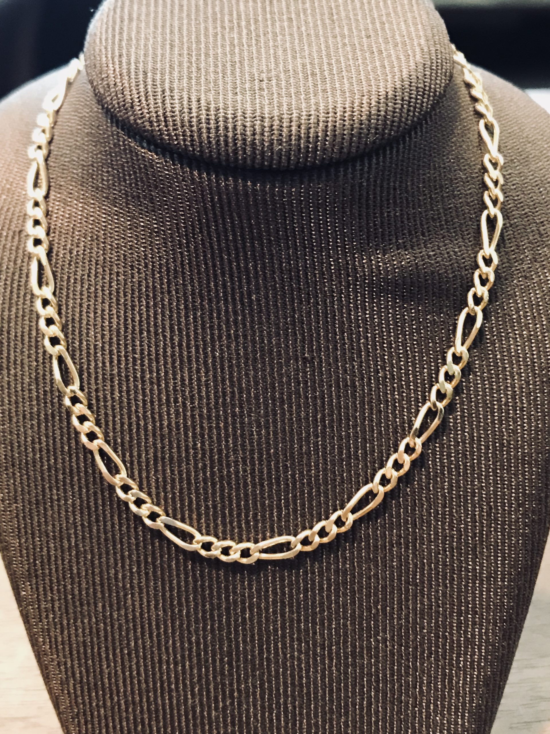 Chaine maille alternée 3+1 en or jaune 750 millièmes. Elle mesure 50 centimètres de long et 2,7 millimètres de large.