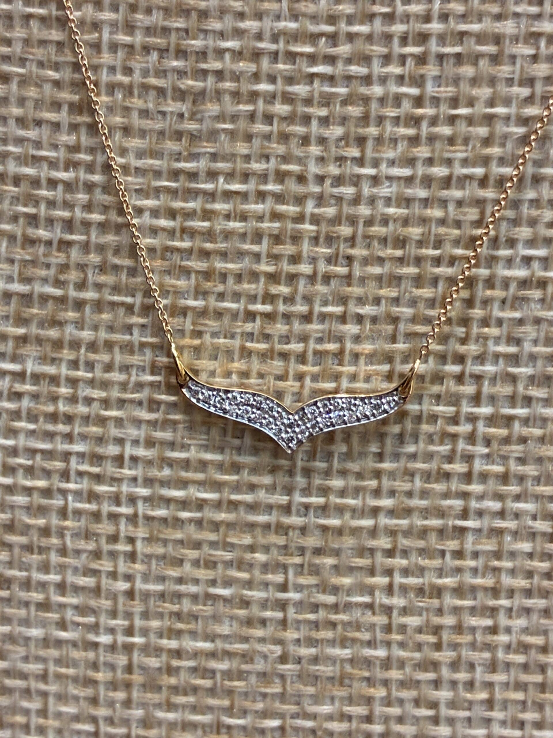 Sublime collier en Or Rose 750 millièmes de la marque Ginette New York, avec un très joli motif en forme d'aile entièrement serti de Diamants. Il est accompagné d'une chaine maille Forçat ronde avec un anneau intermédiaire à 39cm qui vous permettra d'ajuster la longueur en fonction de vos tenues.