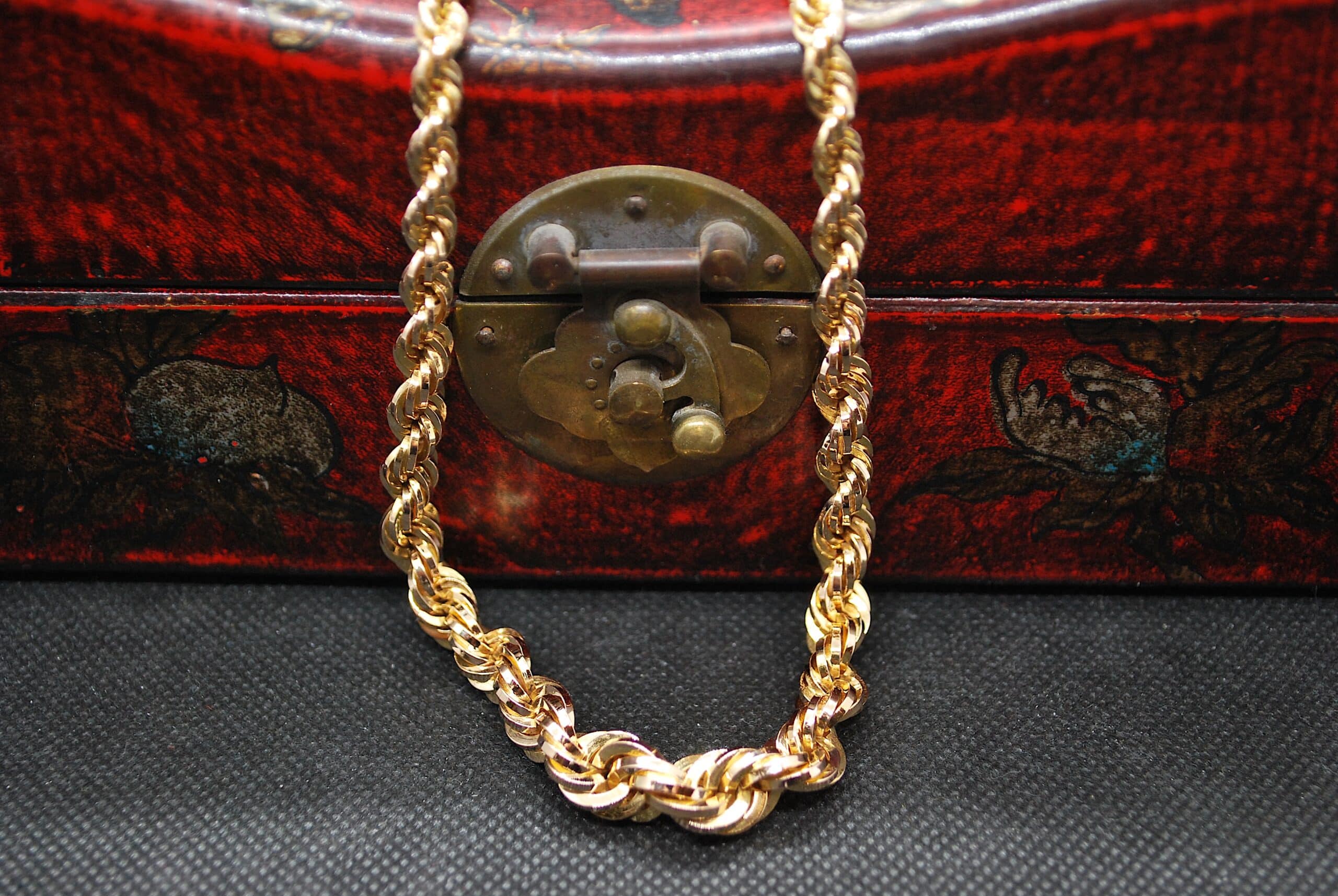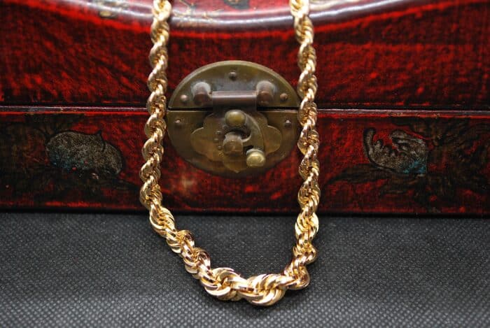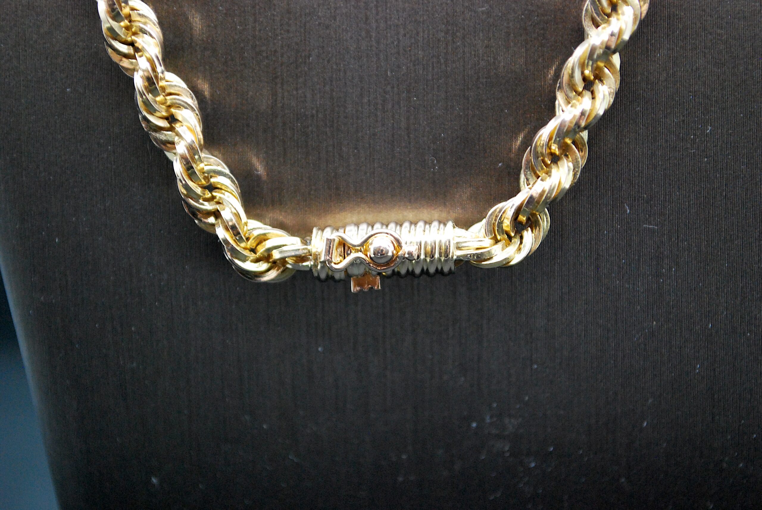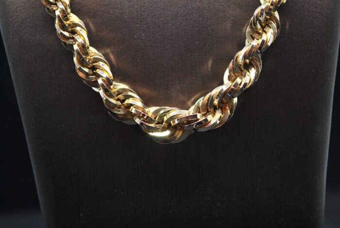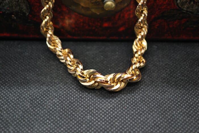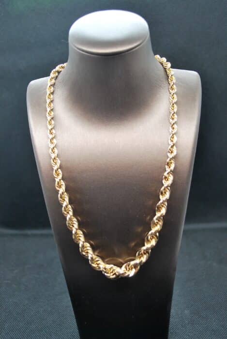 Rare et sublime collier en Or Jaune 750 millièmes maille Corde en chute, de 9mm au centre et de 5,5mm aux extrémités. Son fermoir cliquet doublé d'un huit de sécurité vous assureront une tenue irréprochable à votre cou. Vous saurez apprécier la qualité de travail réalisé sur ce collier. Ce bijou d'occasion a entièrement été vérifié et certifié dans notre atelier.