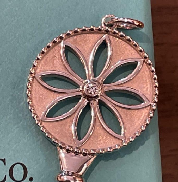 Très jolie pendentif "Tiffany & Co" en Argent 925 millièmes avec un diamant de 0,035 carats en G-VS. Ce bijou fait partie de la collection "Clé Pâquerette" et symbolise la féminité et l'élégance.